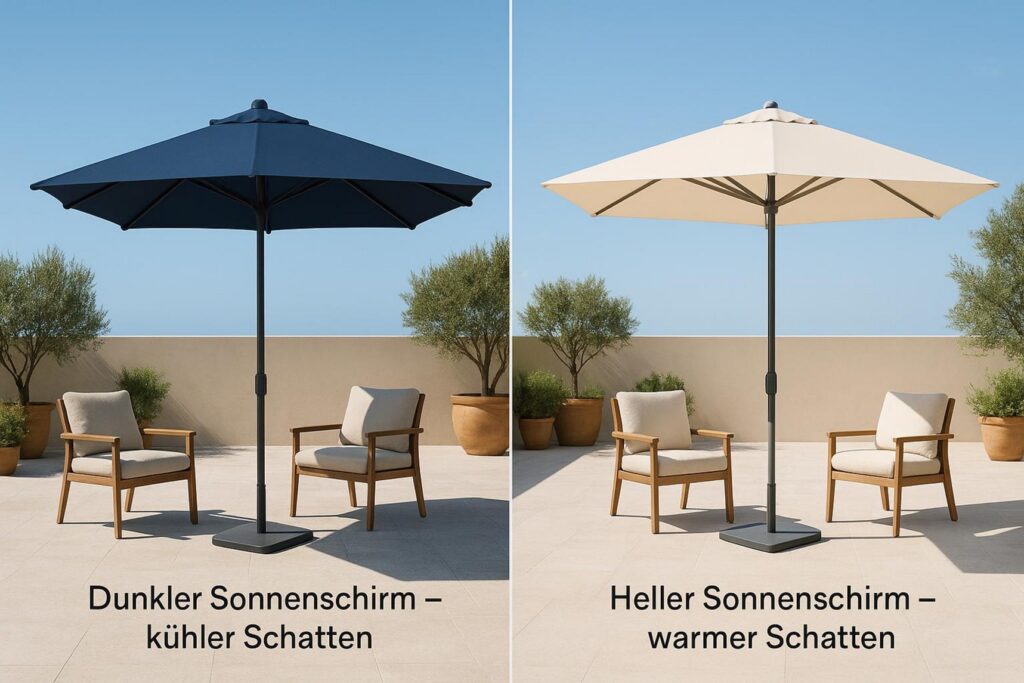 Neben Material und Stoffklasse spielen auch Farbe und Beschichtungen eine Rolle. Sie beeinflussen UV-Schutz, die Wärme unter dem Schirm und wie lange der Stoff gut aussieht.