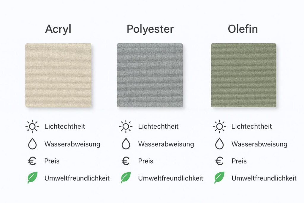 Hightech-Stoffe sind die modernste Variante. Sie verbinden neue Fasern mit speziellen Beschichtungen, damit UV-Schutz, Wetterfestigkeit und Haltbarkeit sehr hoch sind. Häufig gibt es Nano- oder Teflonbeschichtungen, damit Wasser abperlt und der Stoff leichter sauber bleibt.